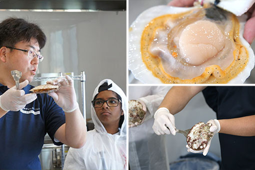 女川湾で養殖されたホタテの清掃作業・捌き方・試食、さんまの昆布巻体験・海鮮丼の盛り付け体験など、女川の海について学ぶためのコンテンツ満載です。
